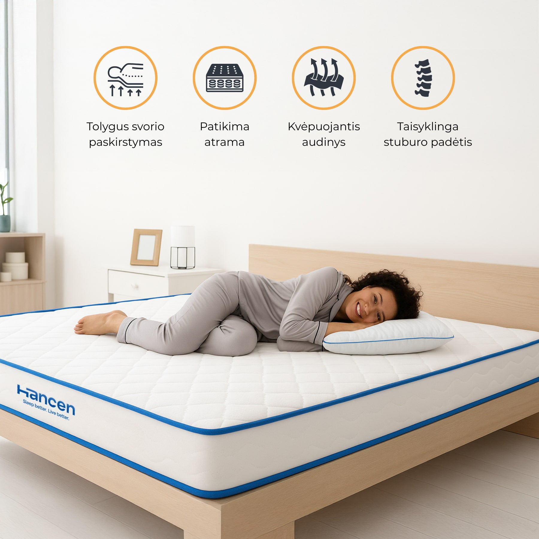 HANCEN prekės ženklas gimė Lietuvoje iš idėjos kurti produktus, kurie užtikrina sveiką, ramų ir komfortišką miegą. Naudojame tik pažangiausias technologijas ir sertifikuotas, draugiškas aplinkai medžiagas.