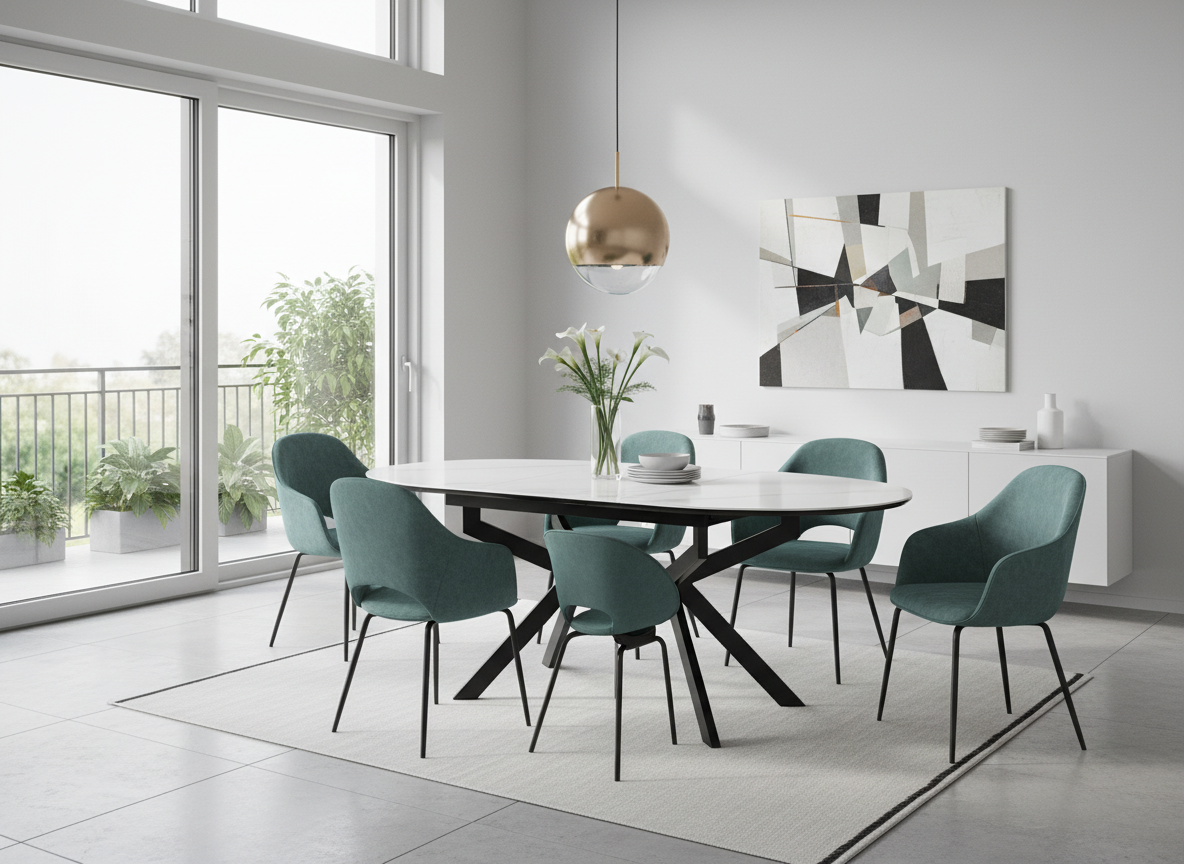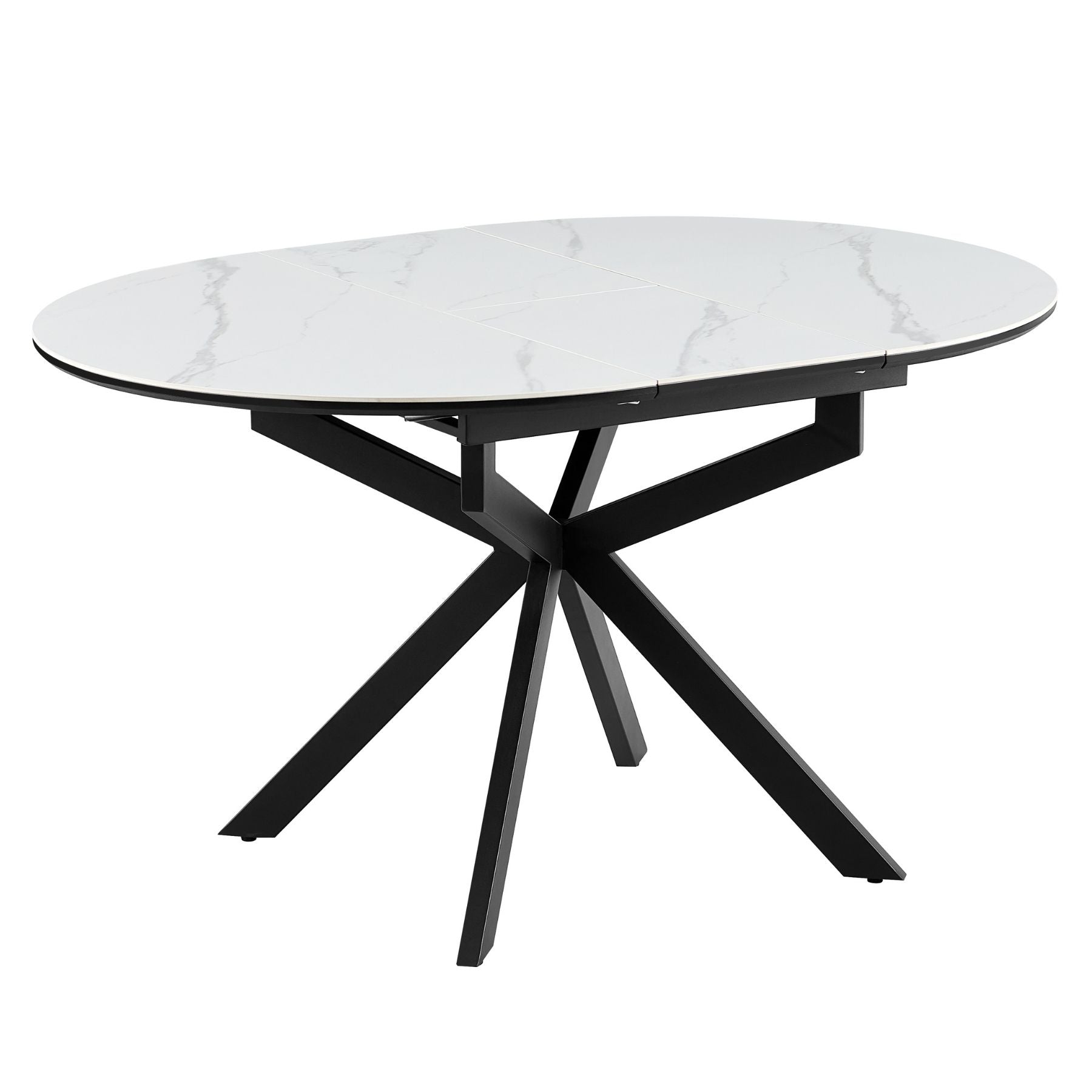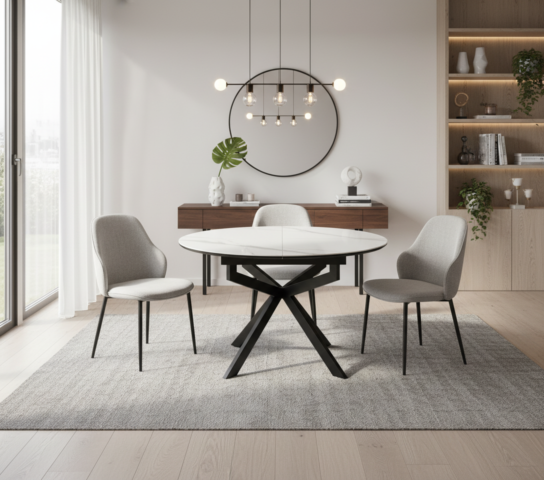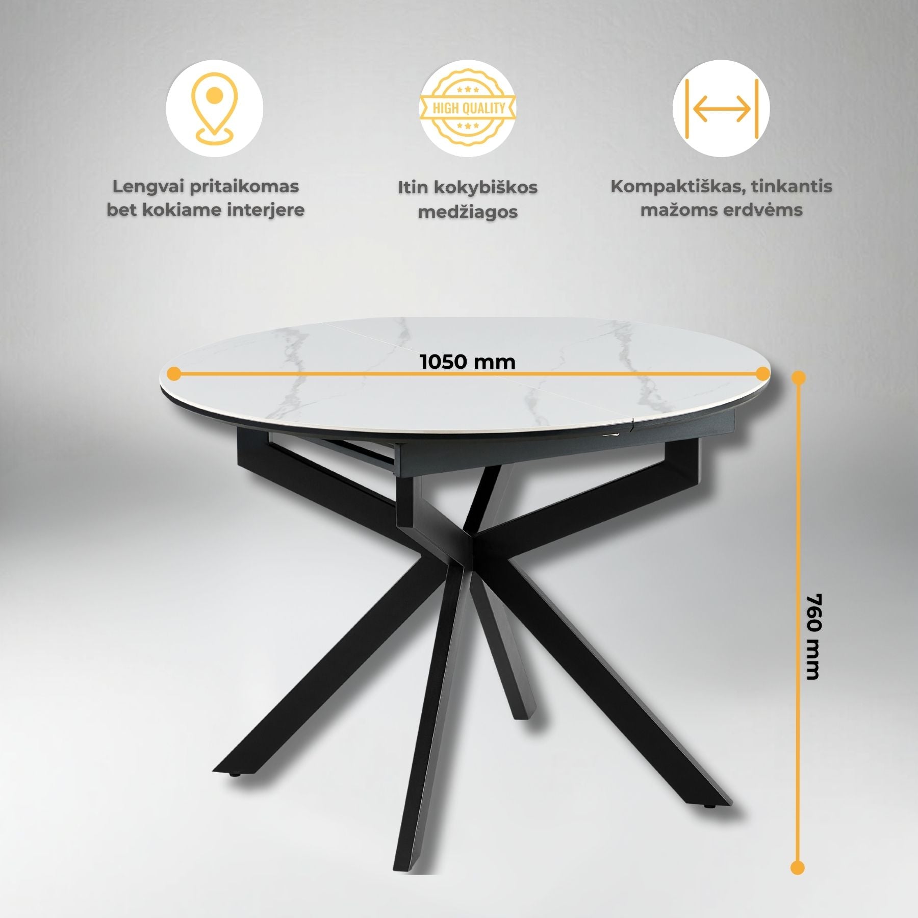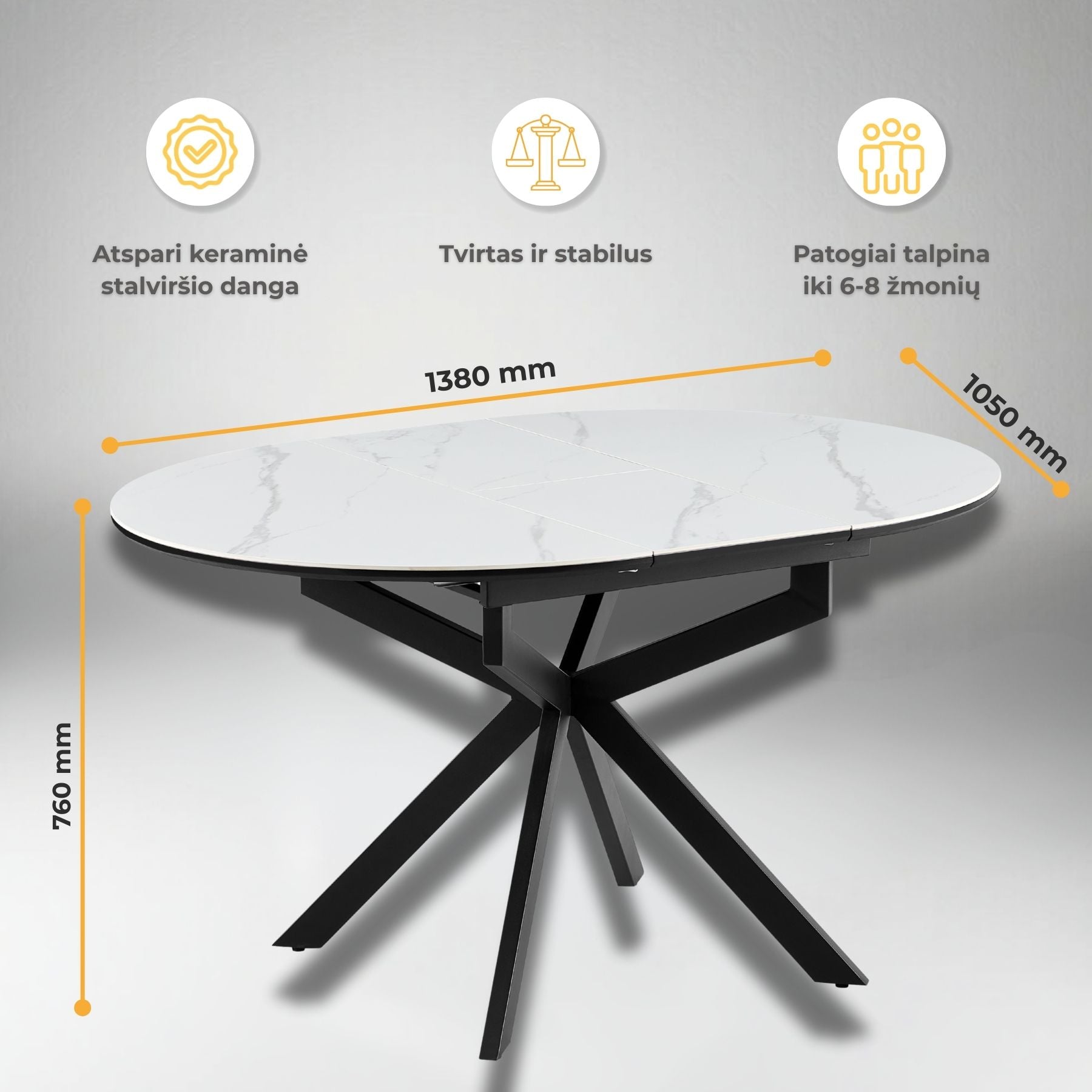 Šis stalas sukurtas ieškantiems prabangos ir praktiškumo. Itin patvarus balto marmuro rašto keramikos stalviršis ne tik atrodo išskirtinai stilingai, bet ir yra atsparus įbrėžimams, karščiui bei lengvai valomas. Juodos matinės metalo kojos suteikia konstrukcijai stabilumo ir modernumo pojūtį, o jų unikalus kryžminis dizainas tampa interjero akcentu.