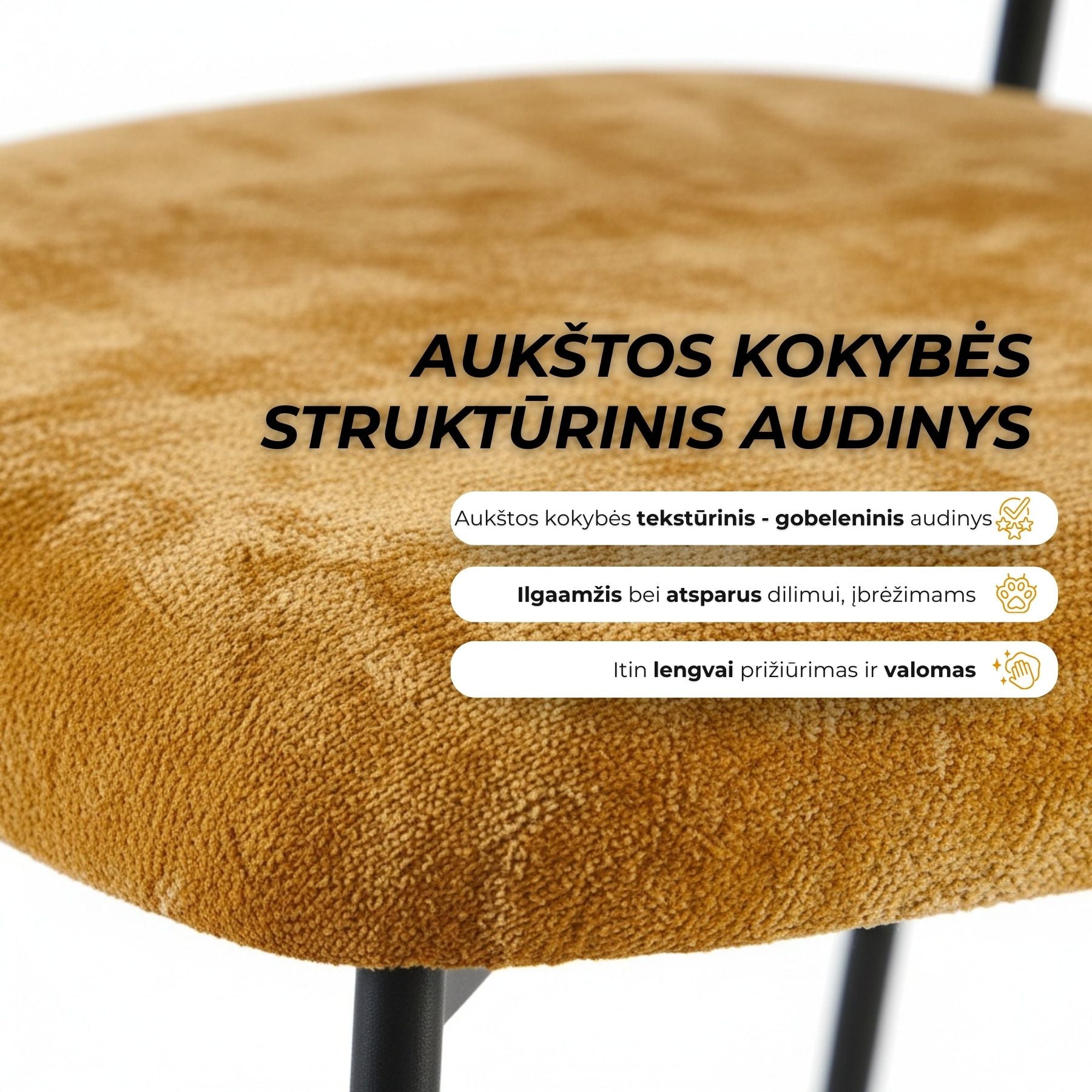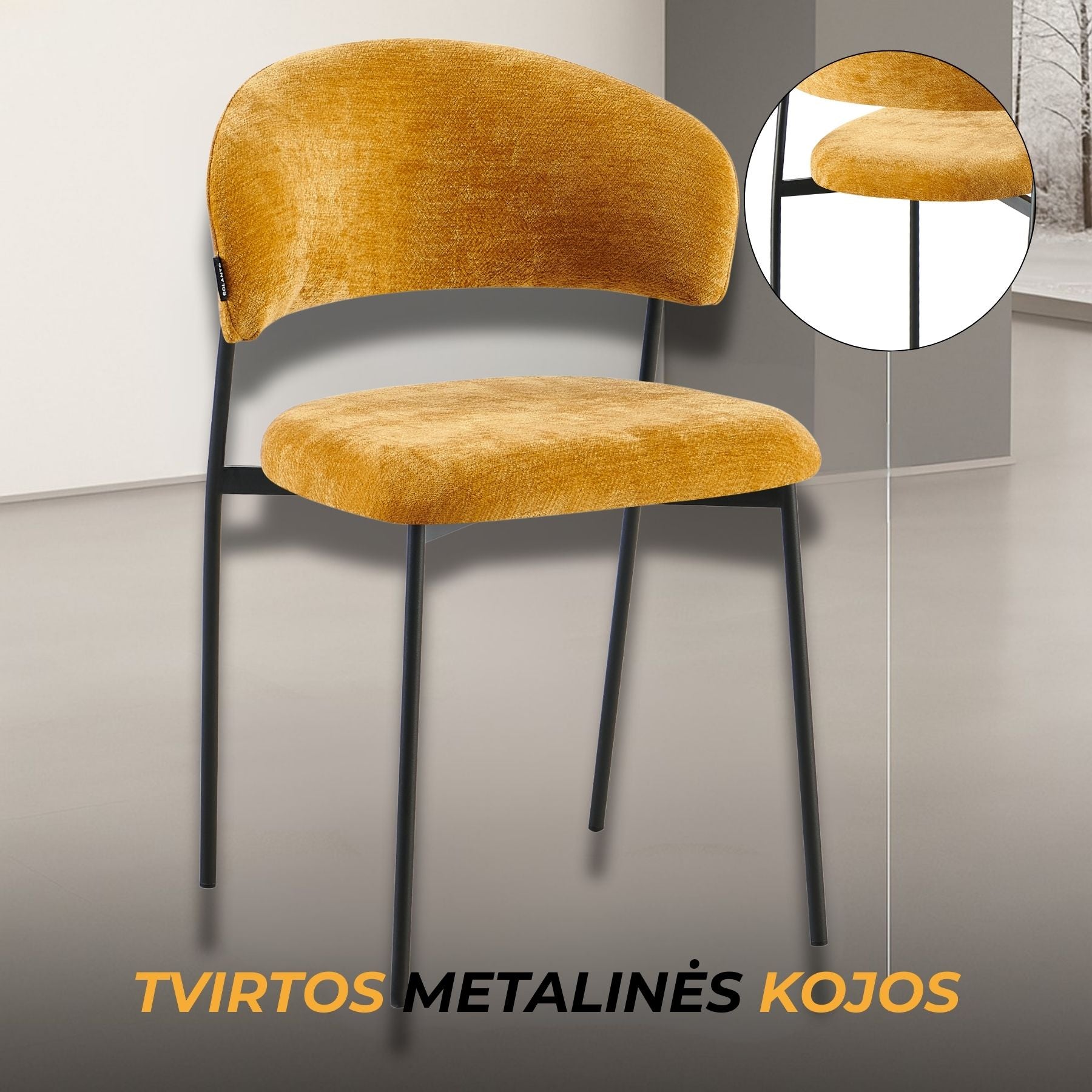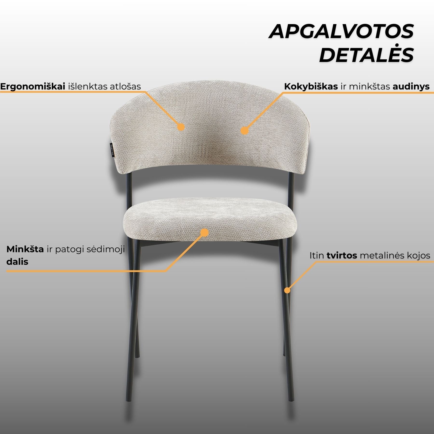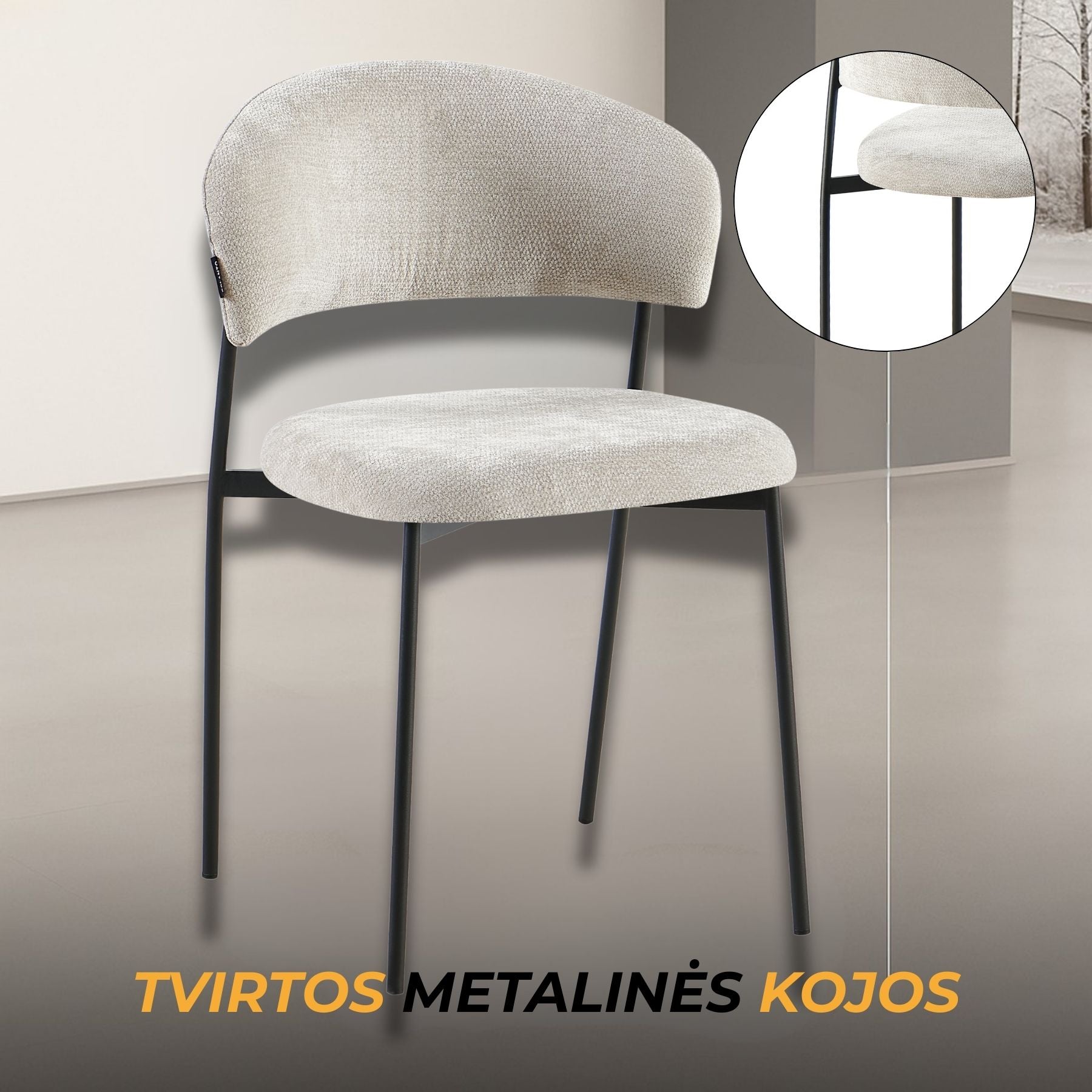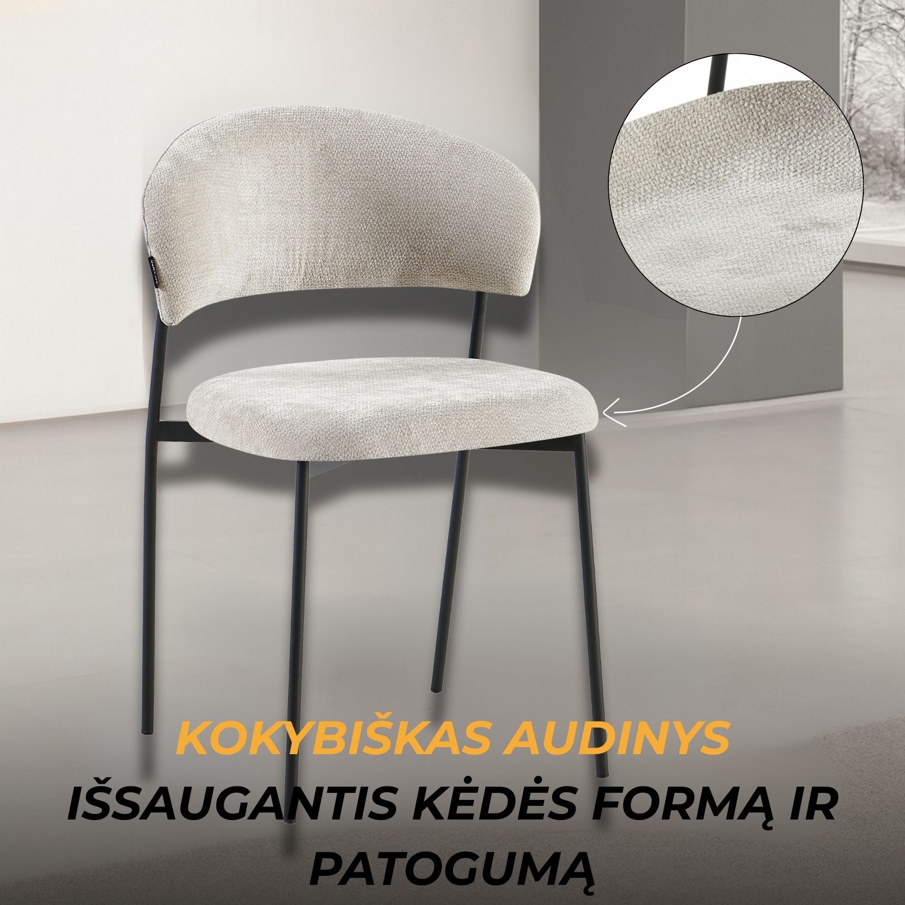 Kėdė EDI - elegantiška forma, švelniai lenkta atlošo linija, suteikianti išskirtinumo ir užtikrinanti patogią atramą nugarai. Minkšta sėdimoji dalis aptraukta švelniai tekstūruotu audiniu, kuris malonus liesti ir lengvai derinamas prie įvairių interjero sprendimų. Ši kėdė – puikus pasirinkimas ieškantiems baldo, kuris derintų komfortą, kokybę ir šiuolaikišką estetiką.