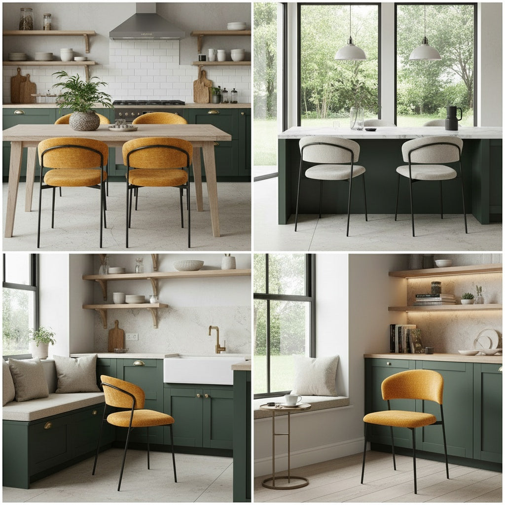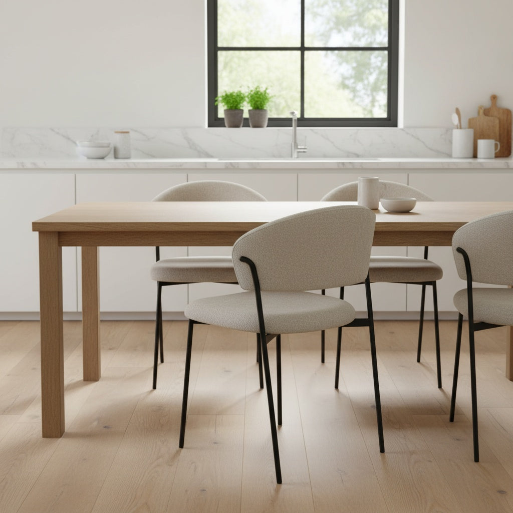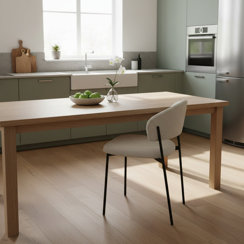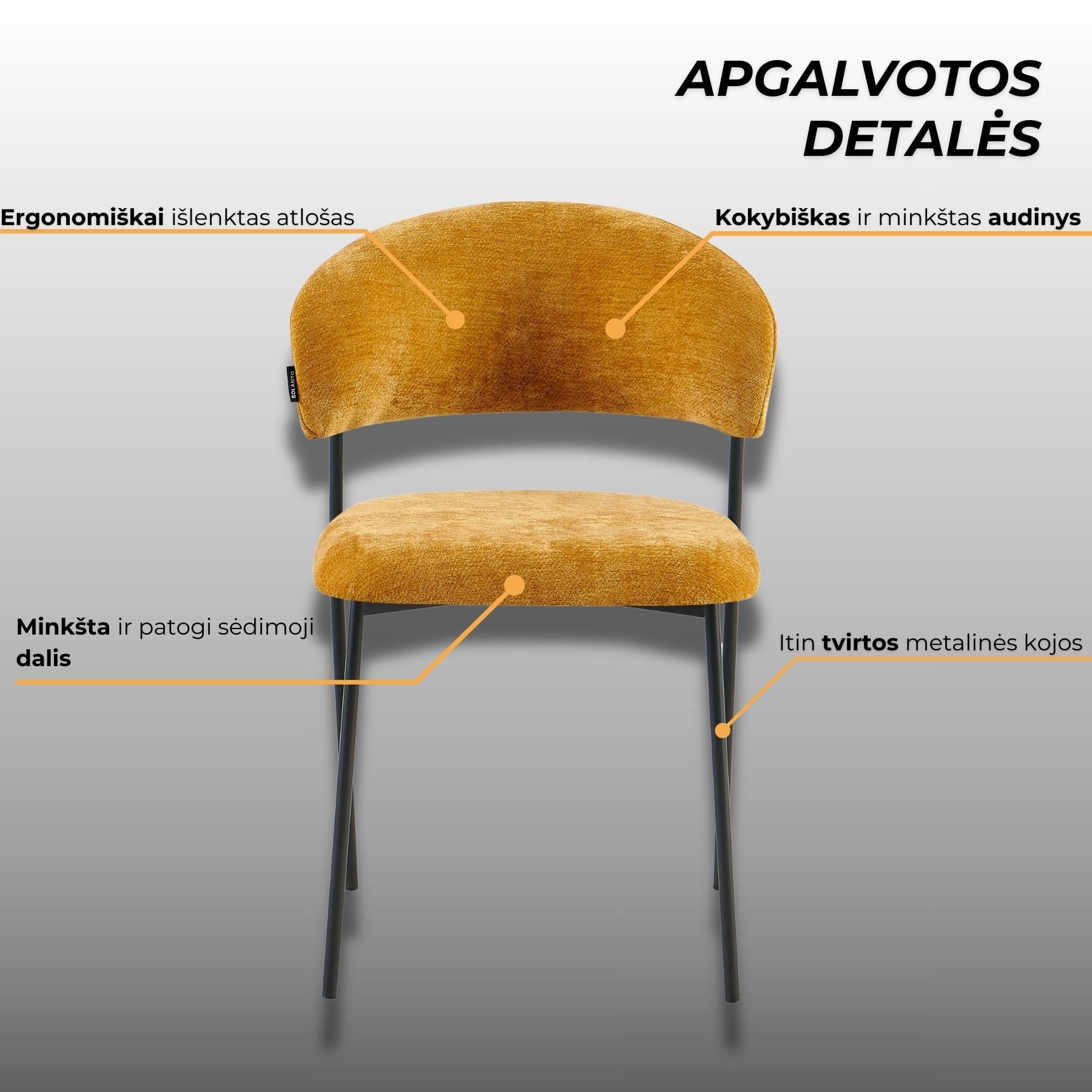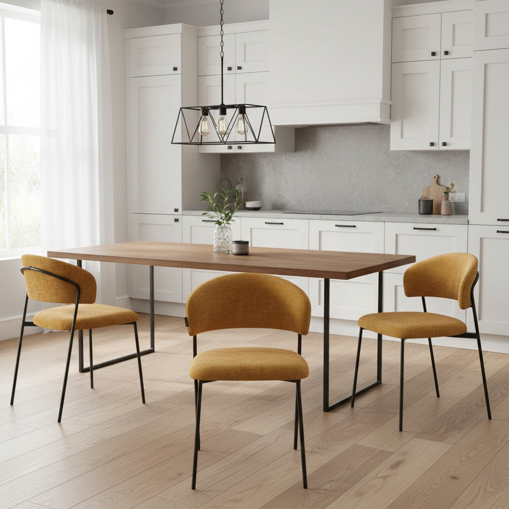 Kėdė EDI - elegantiška forma, švelniai lenkta atlošo linija, suteikianti išskirtinumo ir užtikrinanti patogią atramą nugarai. Minkšta sėdimoji dalis aptraukta švelniai tekstūruotu audiniu, kuris malonus liesti ir lengvai derinamas prie įvairių interjero sprendimų. Ši kėdė – puikus pasirinkimas ieškantiems baldo, kuris derintų komfortą, kokybę ir šiuolaikišką estetiką.