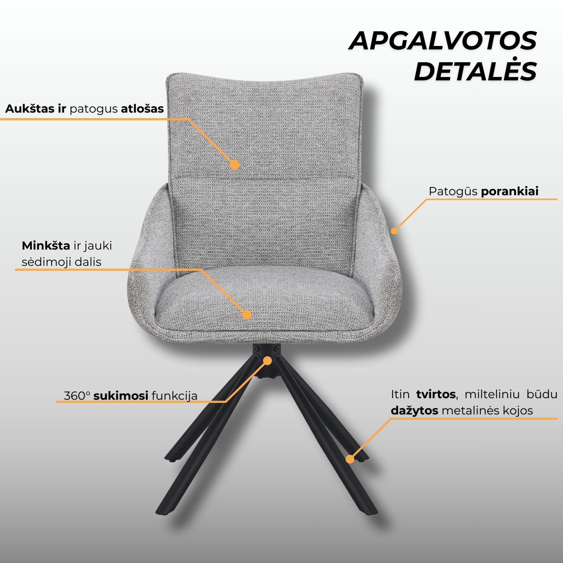 Aukštas ir ergonomiškas atlošas suteikia stabilią atramą visai nugarai, todėl sumažina įtampą ir nuovargį net sėdint ilgesnį laiką. Dėl patogios formos kėdė prisitaiko prie kūno linijų, užtikrindama natūralią sėdėjimo padėtį ir daugiau komforto kasdien.