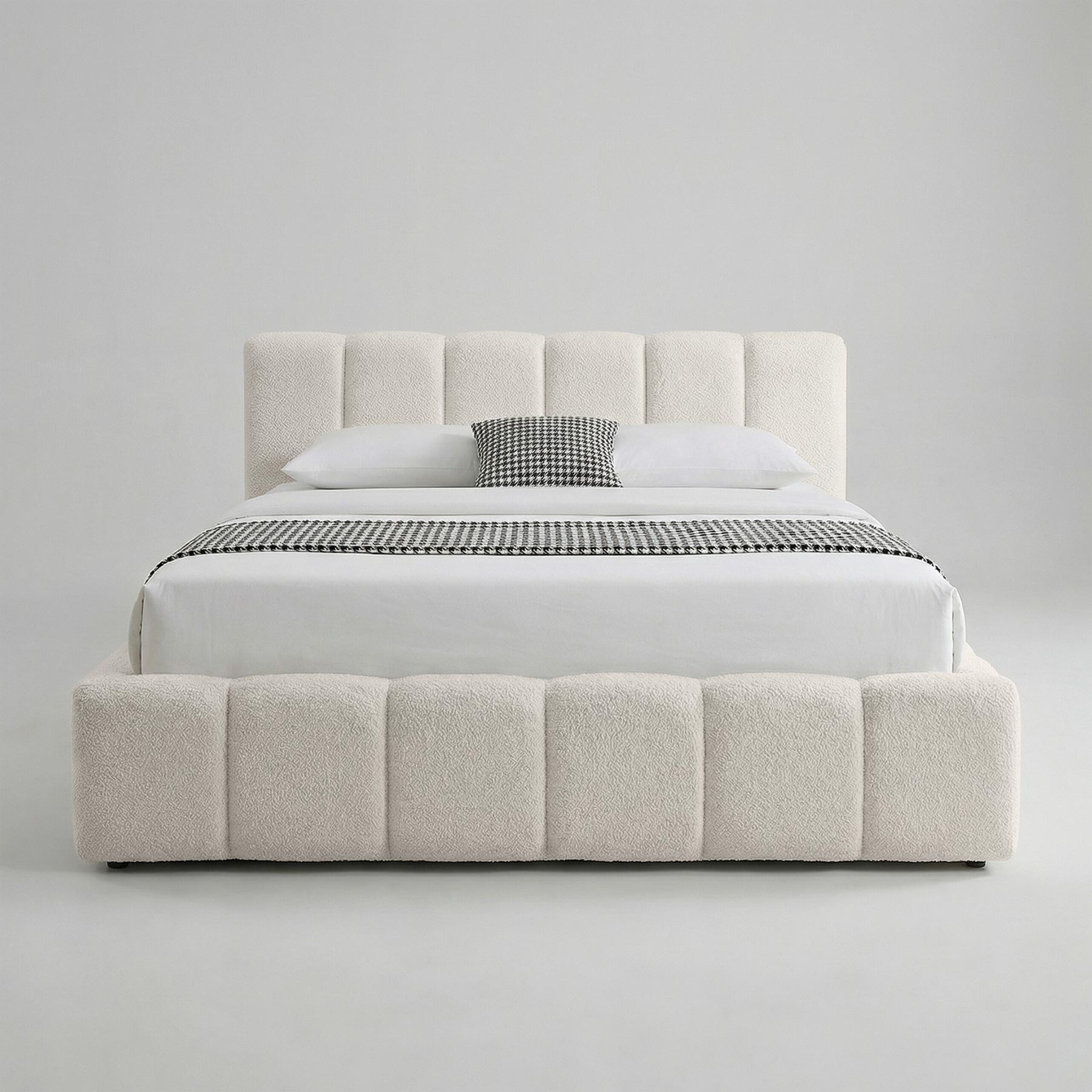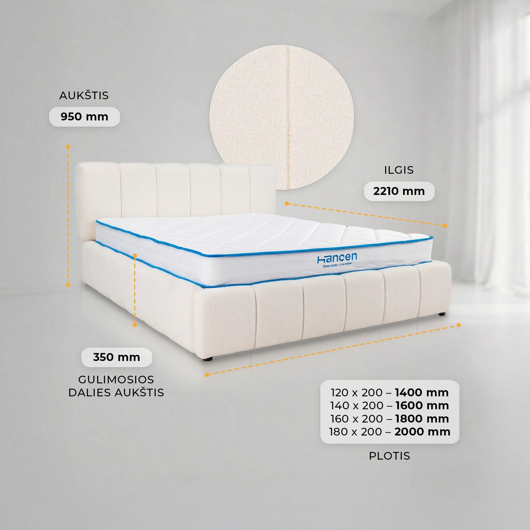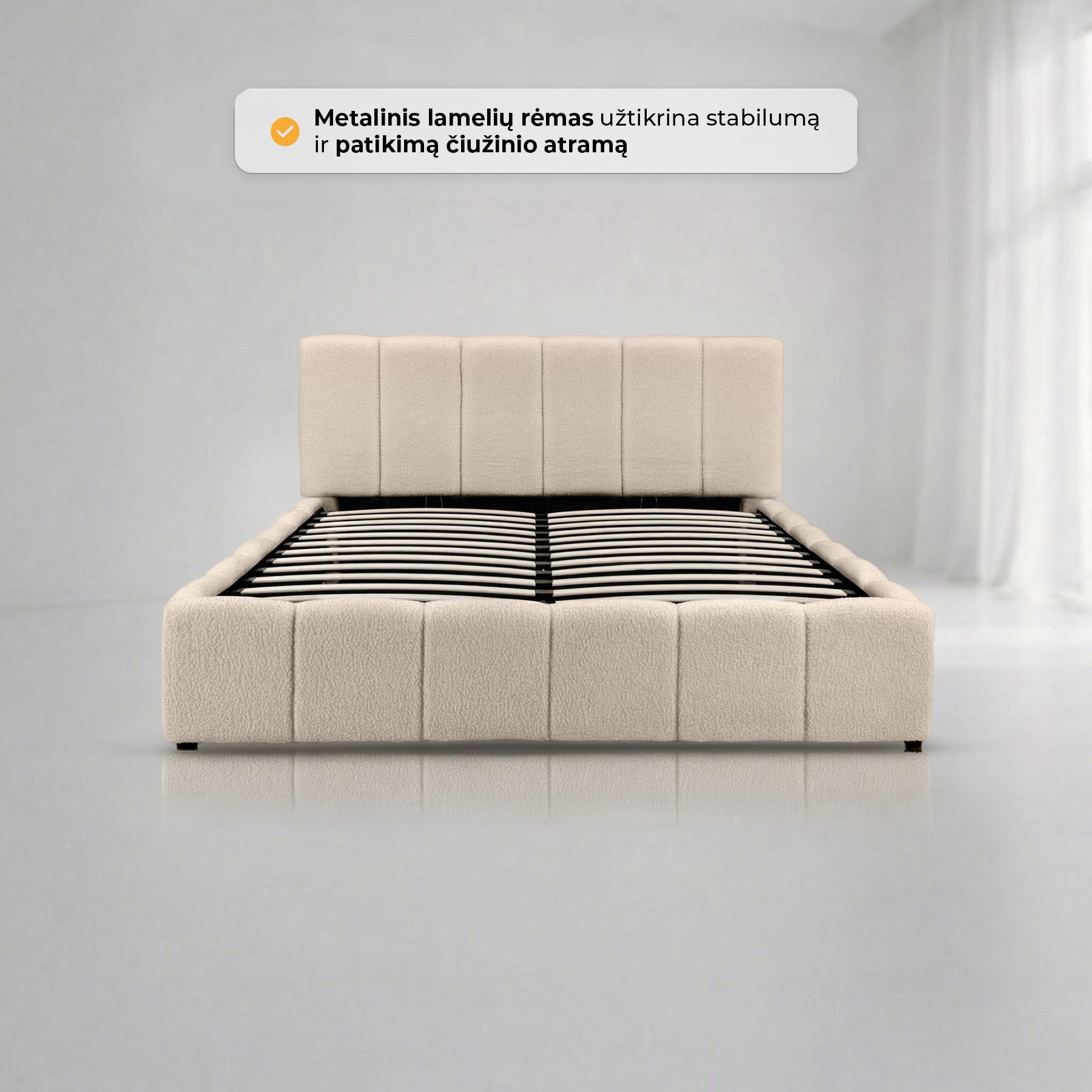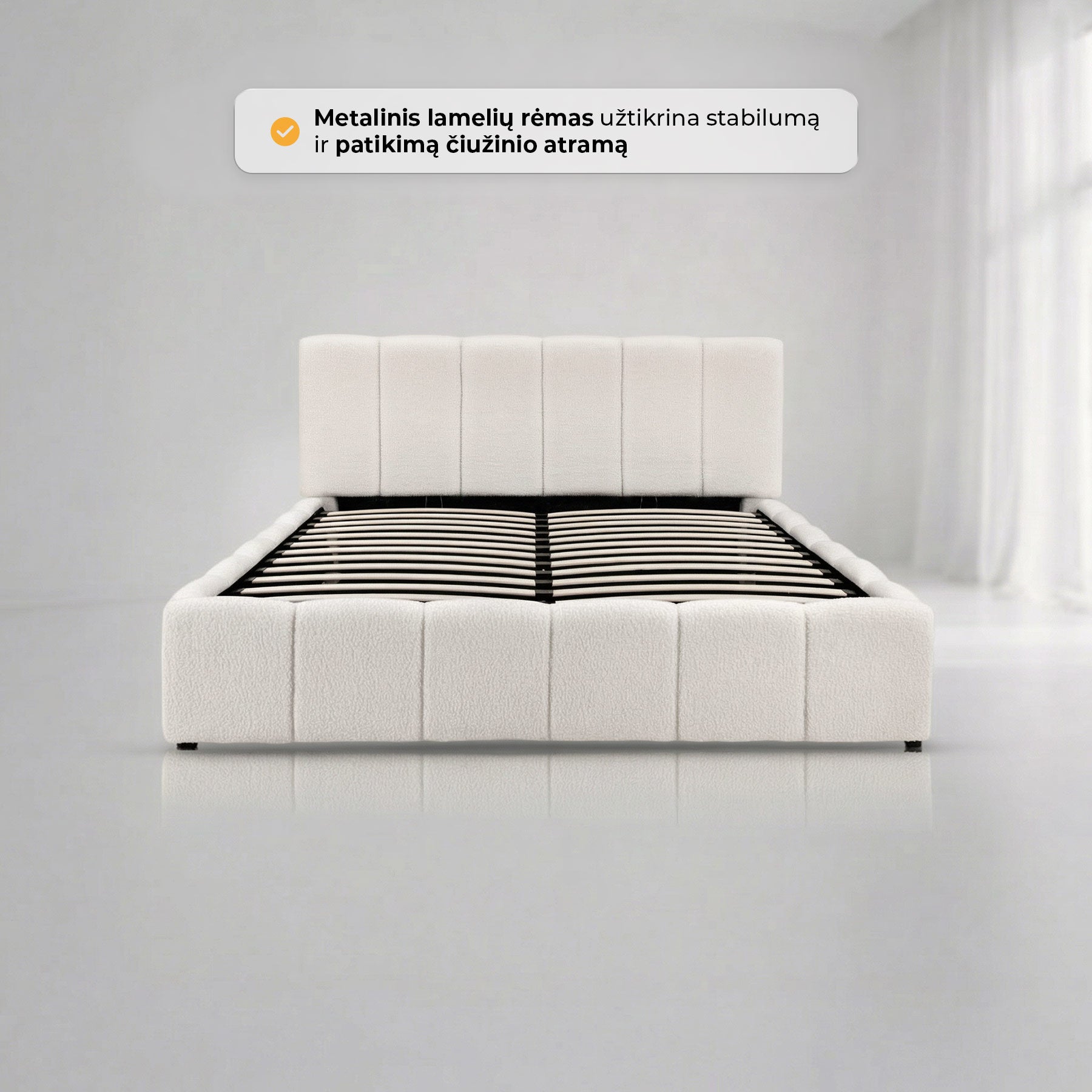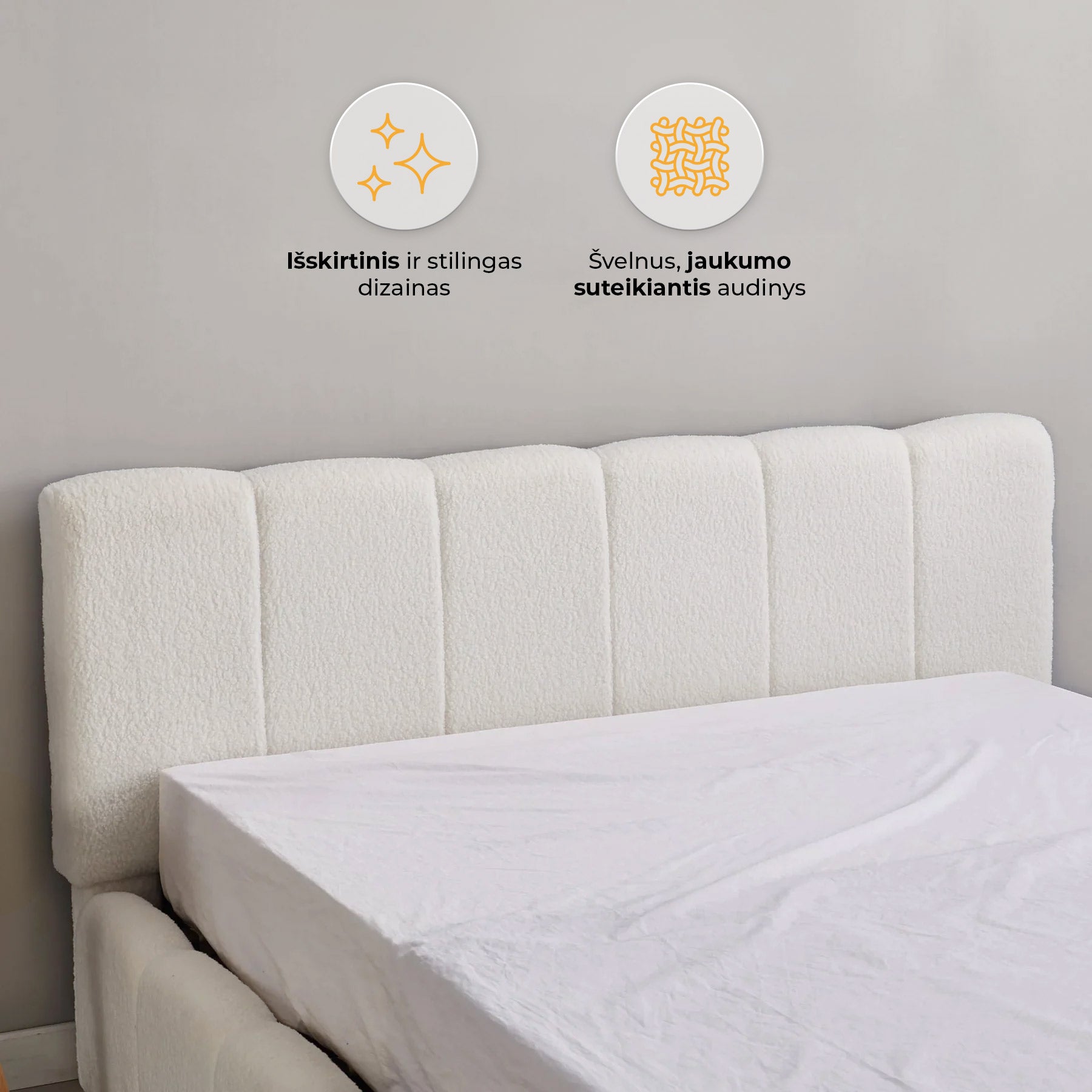 Elegantiška lova AMANDA sujungia modernų dizainą ir praktiškumą. Ji aptraukta madingu bouclé audiniu, kuris suteikia šilumos ir jaukumo pojūtį bei tampa subtiliu interjero akcentu. Vertikalios siūlės sukuria išskirtinį, šiuolaikišką dizainą, puikiai derantį tiek minimalistiniame, tiek klasikiniame miegamojo interjere.