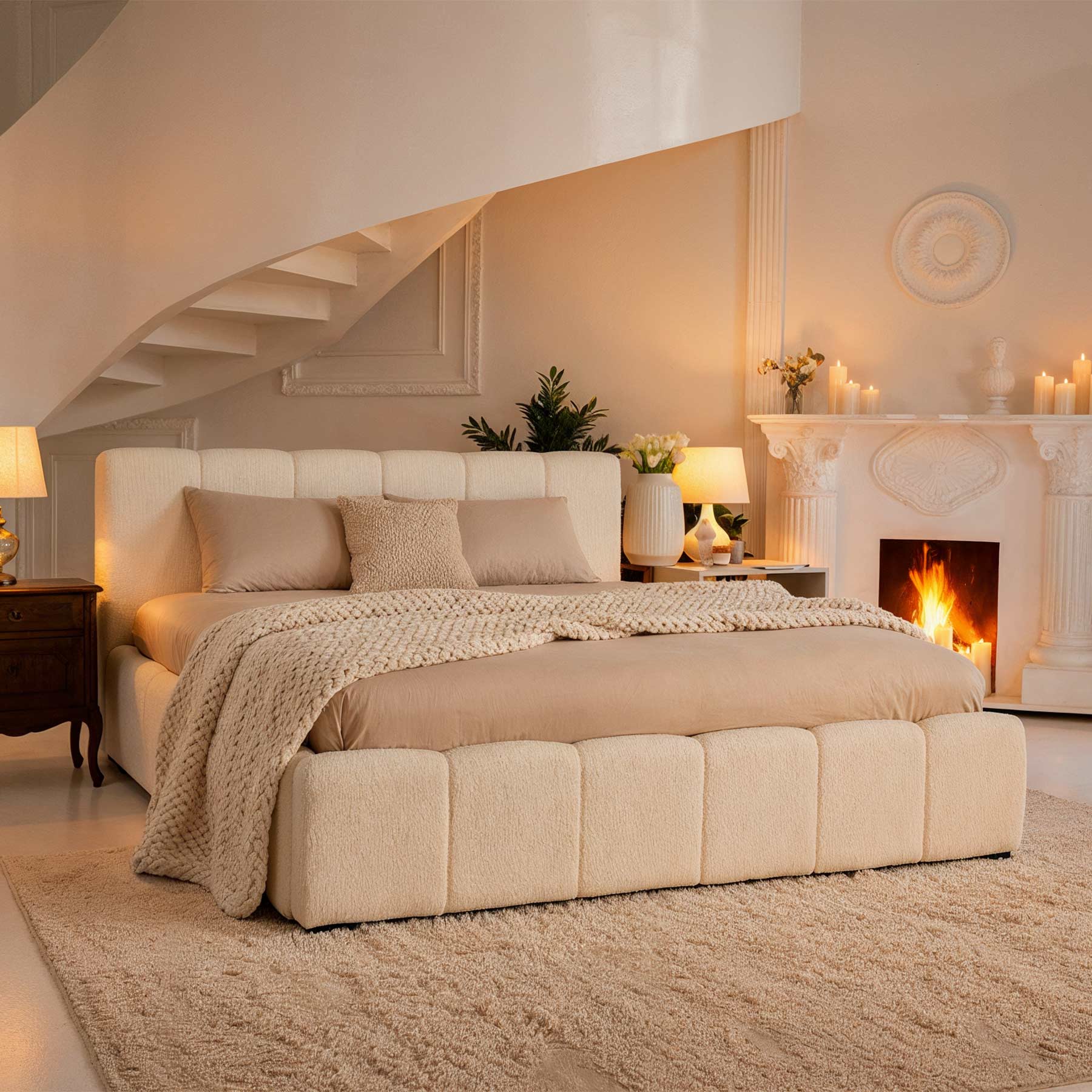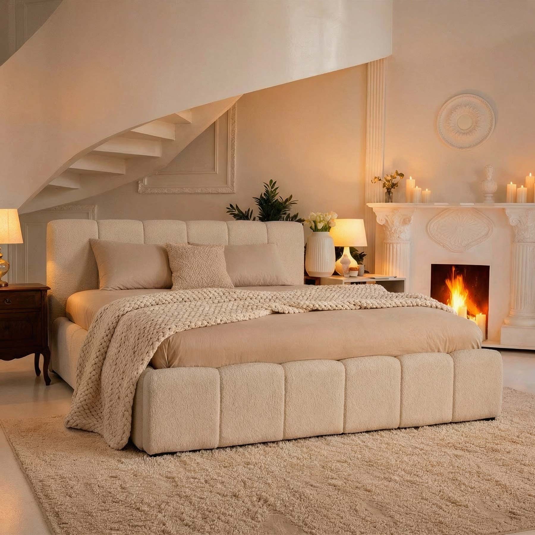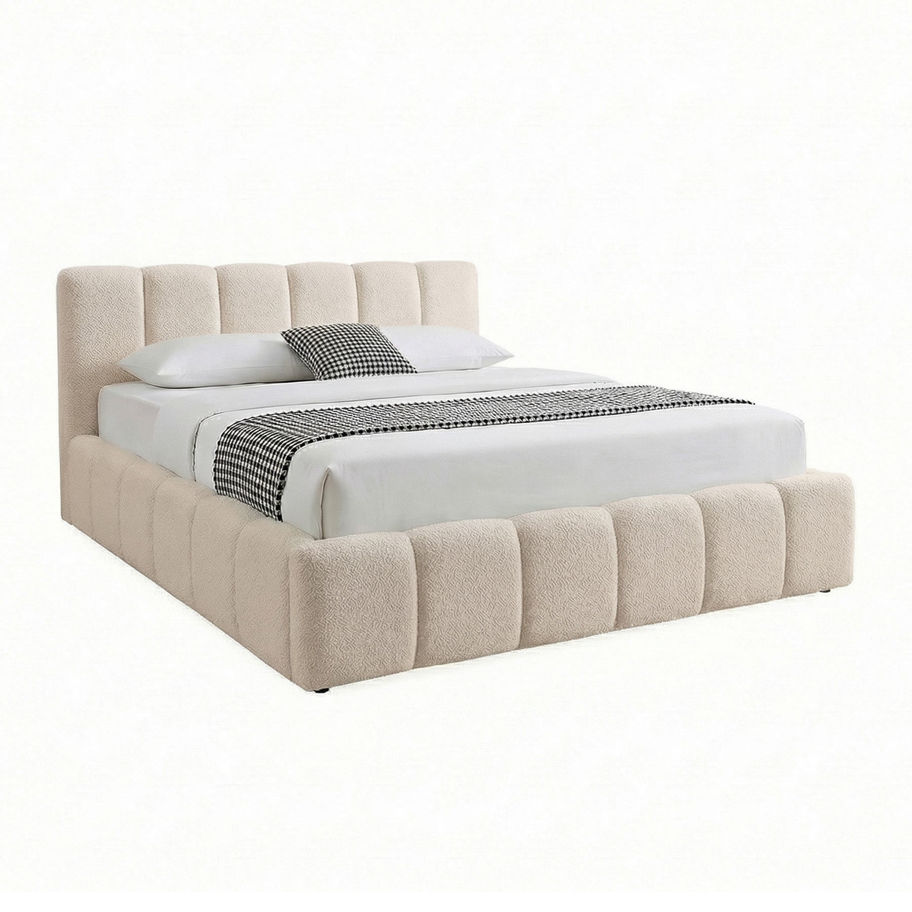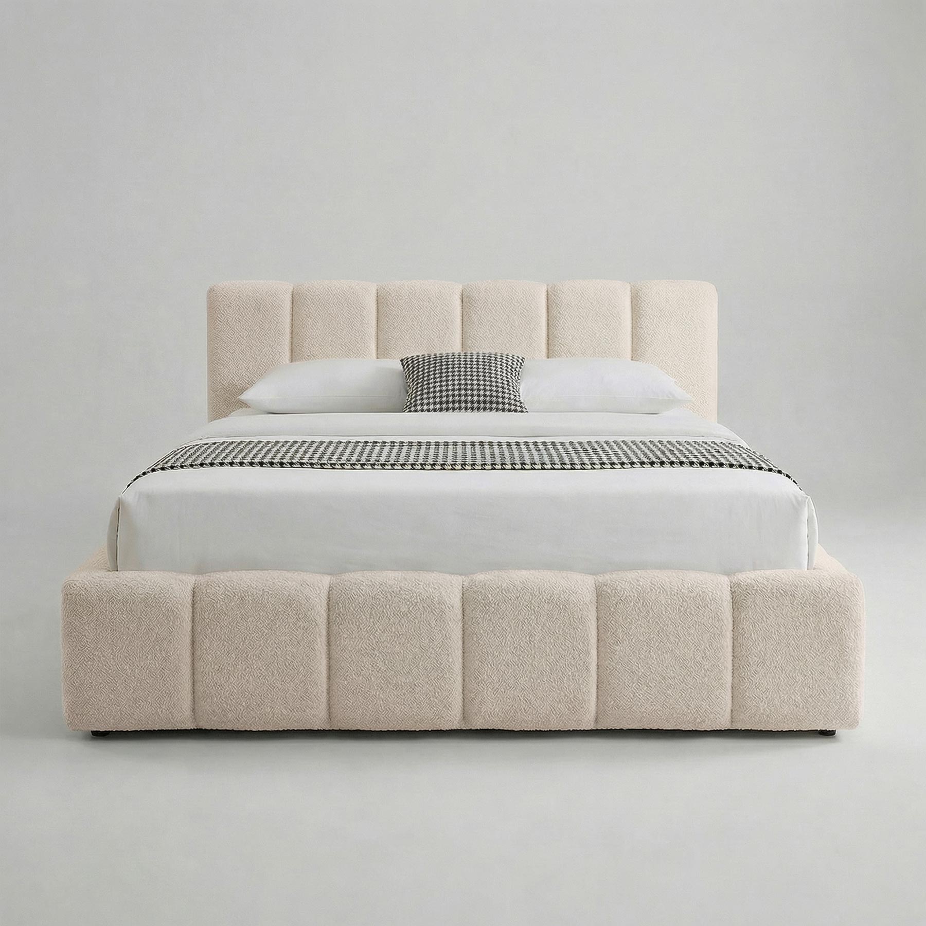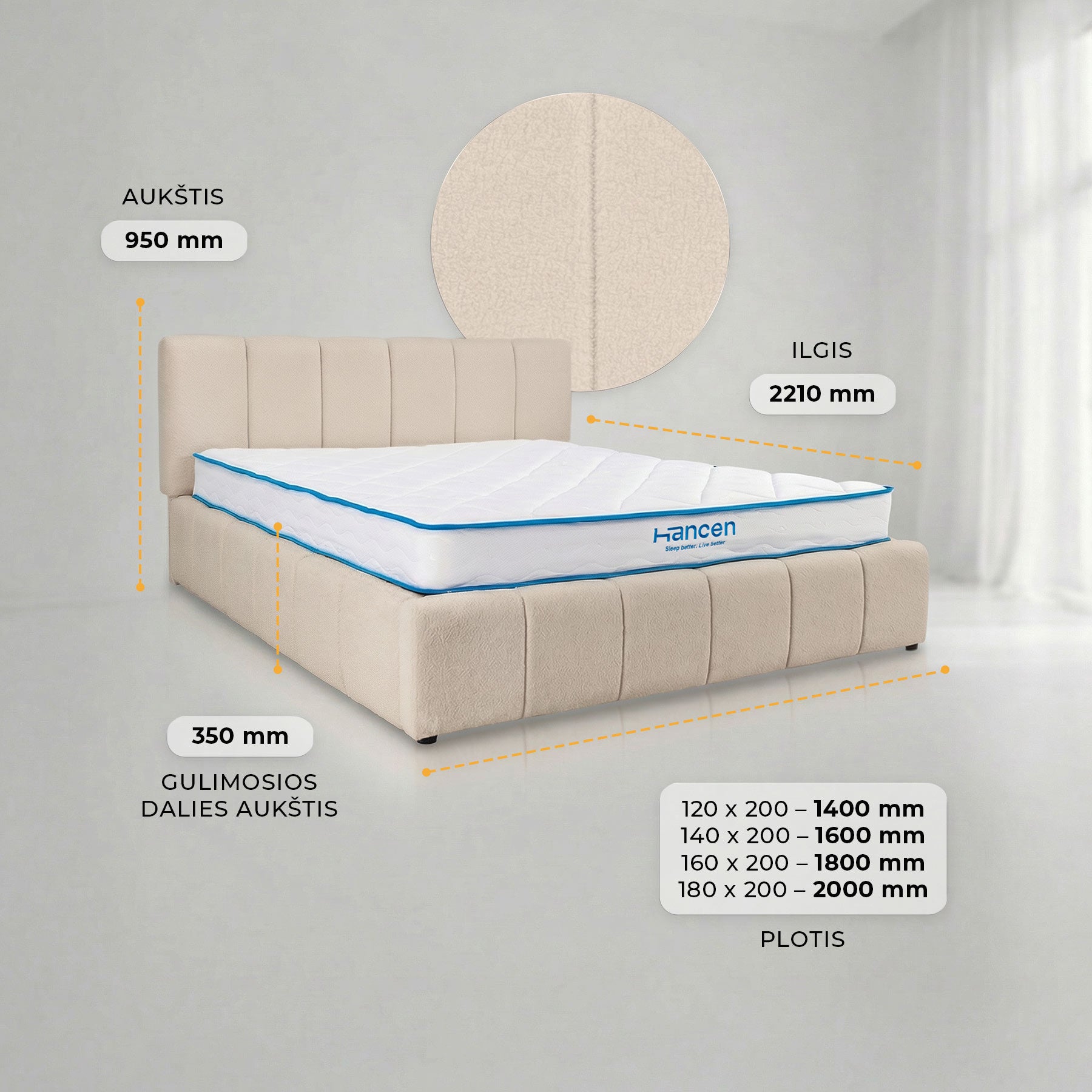 Elegantiška lova AMANDA sujungia modernų dizainą ir praktiškumą. Ji aptraukta madingu bouclé audiniu, kuris suteikia šilumos ir jaukumo pojūtį bei tampa subtiliu interjero akcentu. Vertikalios siūlės sukuria išskirtinį, šiuolaikišką dizainą, puikiai derantį tiek minimalistiniame, tiek klasikiniame miegamojo interjere.