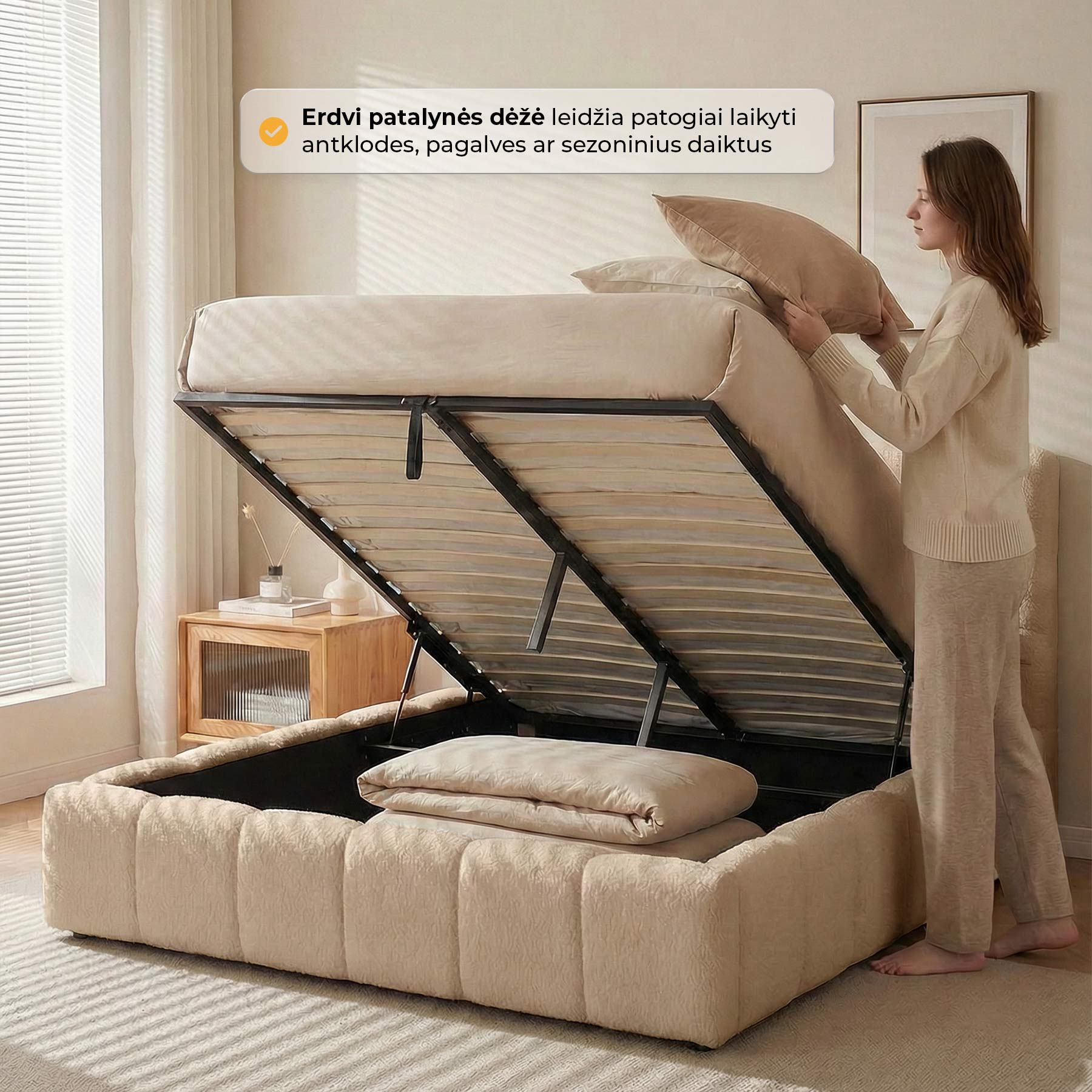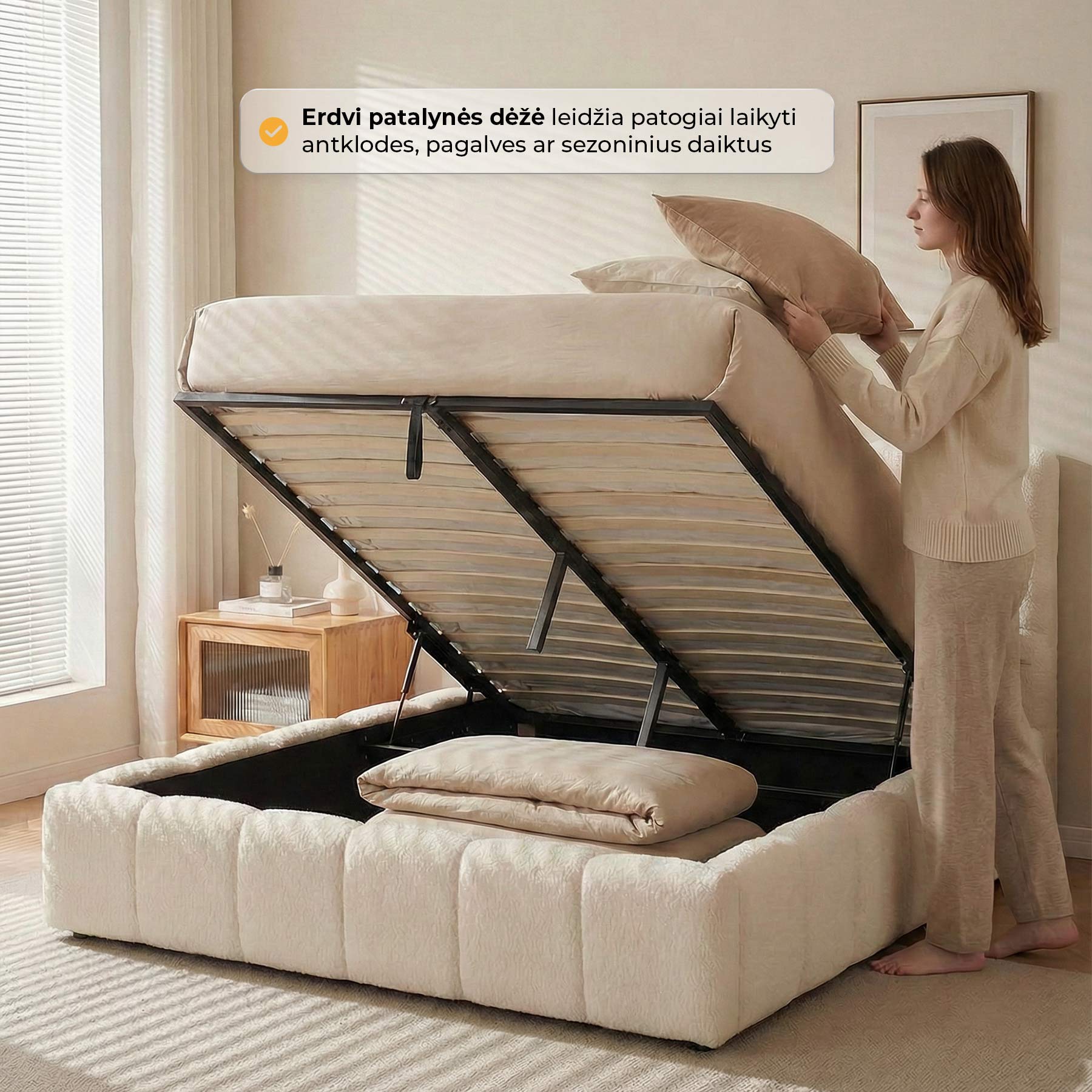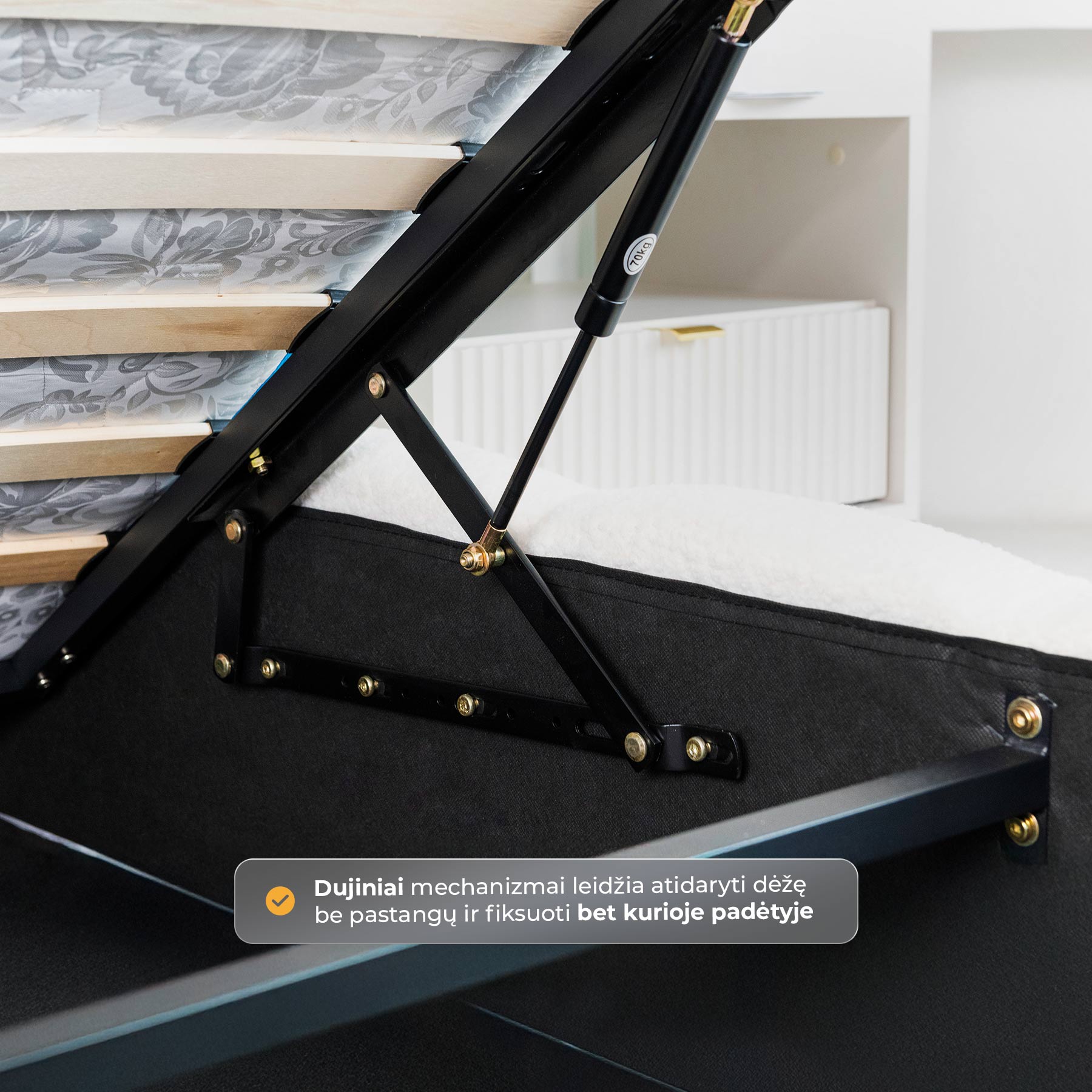 Lova yra ne tik graži, bet ir itin funkcionali – po pakeliamu grotelių pagrindu paslėpta erdvi patalynės dėžė, kurioje lengvai sutalpinsite antklodes, pagalves ar kitus daiktus. Patogus pakėlimo mechanizmas leidžia groteles pakelti be didelių pastangų, o metalinis lamelių rėmas yra itin patvarus.