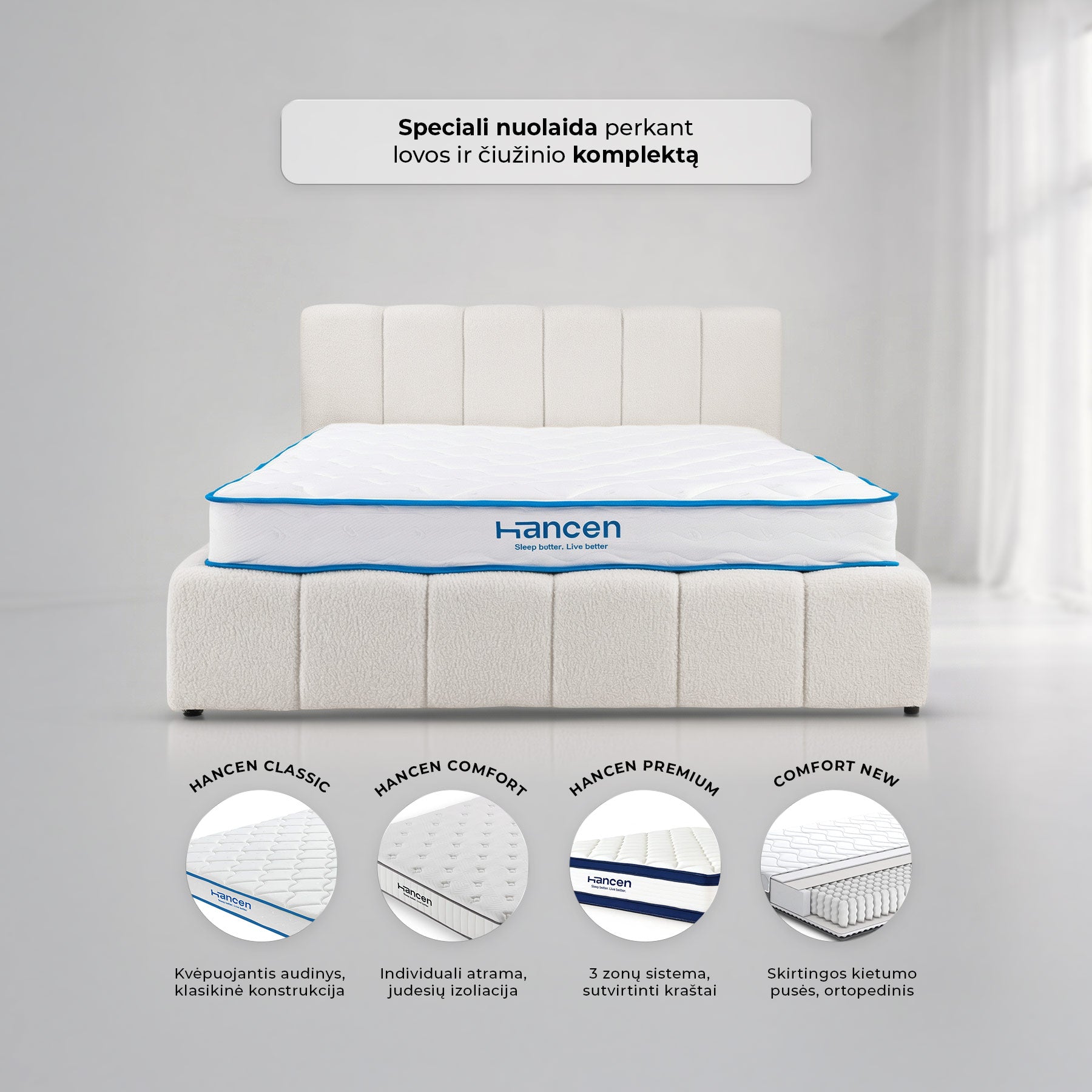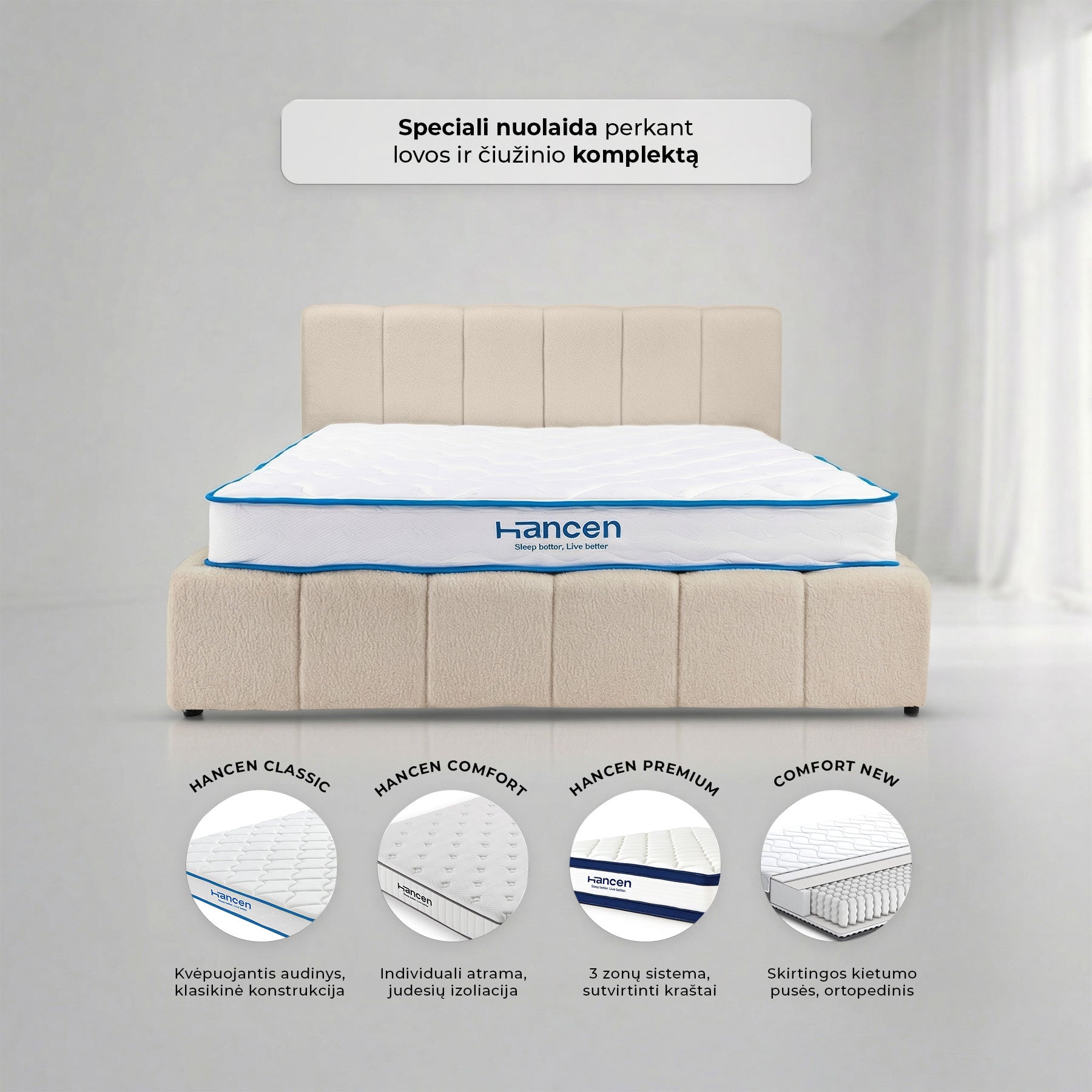 18 cm vidutinės klasės spyruoklinis (multipocket) čiužinys. Jis turi spyruokles, kurios visiškai izoliuoja išorines trintis ir panaikina betkokius spyruoklių sąveikos garsus. Šis čiužinys turi prie kūno prisitaikantį viskoelastinį sluoksnį. Čiužinys vienoje pusėje vidutinio kietumo, o kitoje - pusiau kietas. Comfort čiužinys turi nuimamą, plaunamą užvalkalą. Atlaiko iki 120 kg apkrovą vienoje gulimoje dalyje.