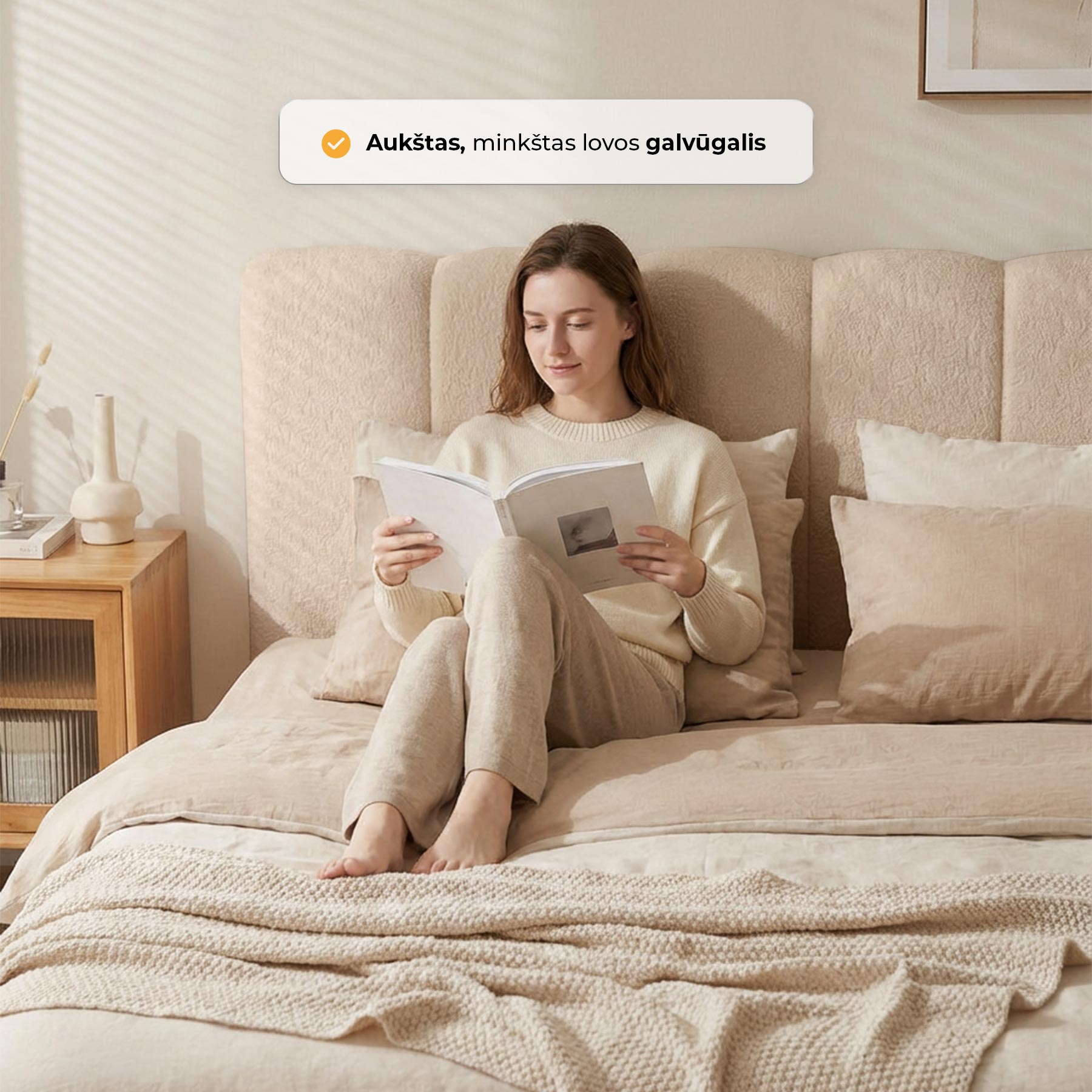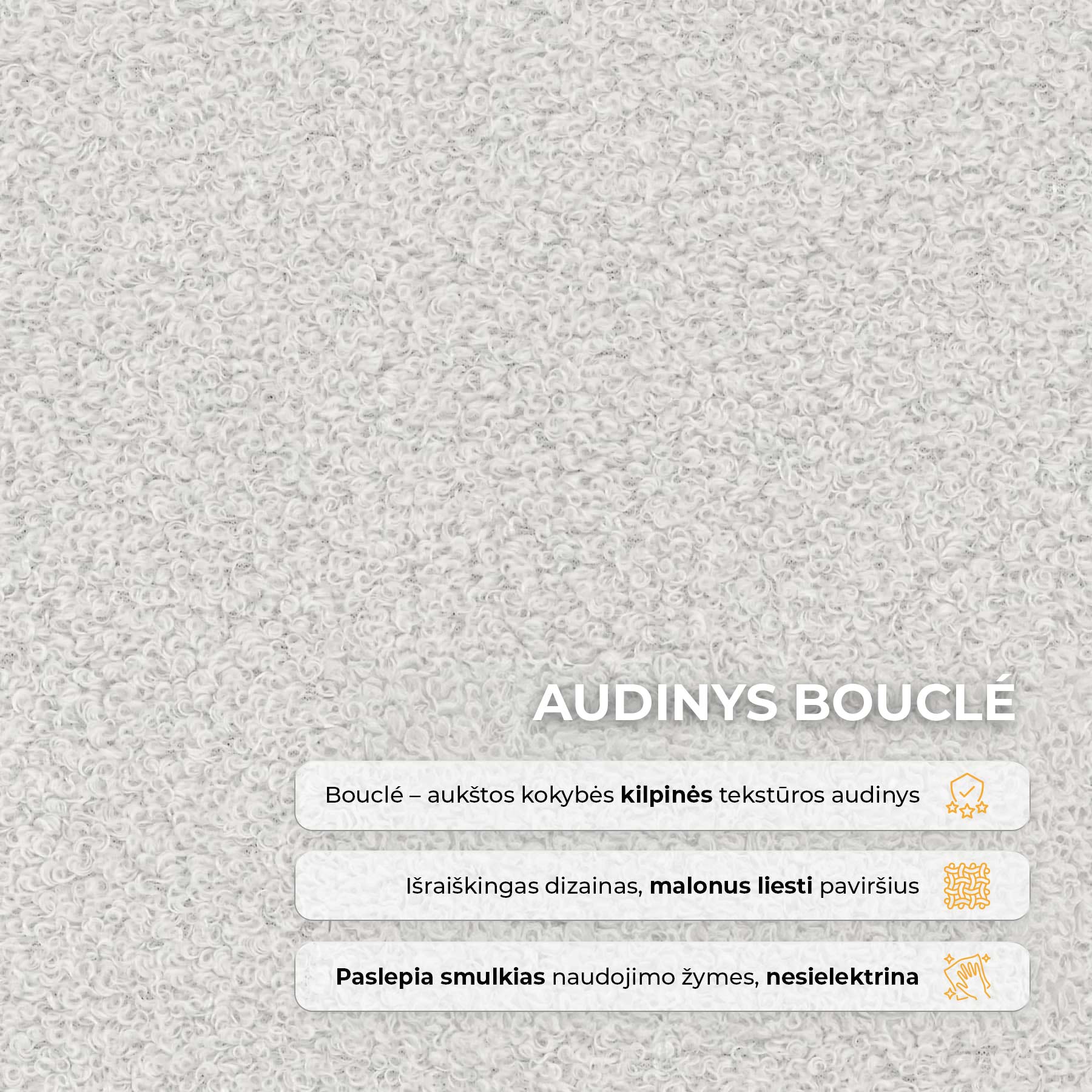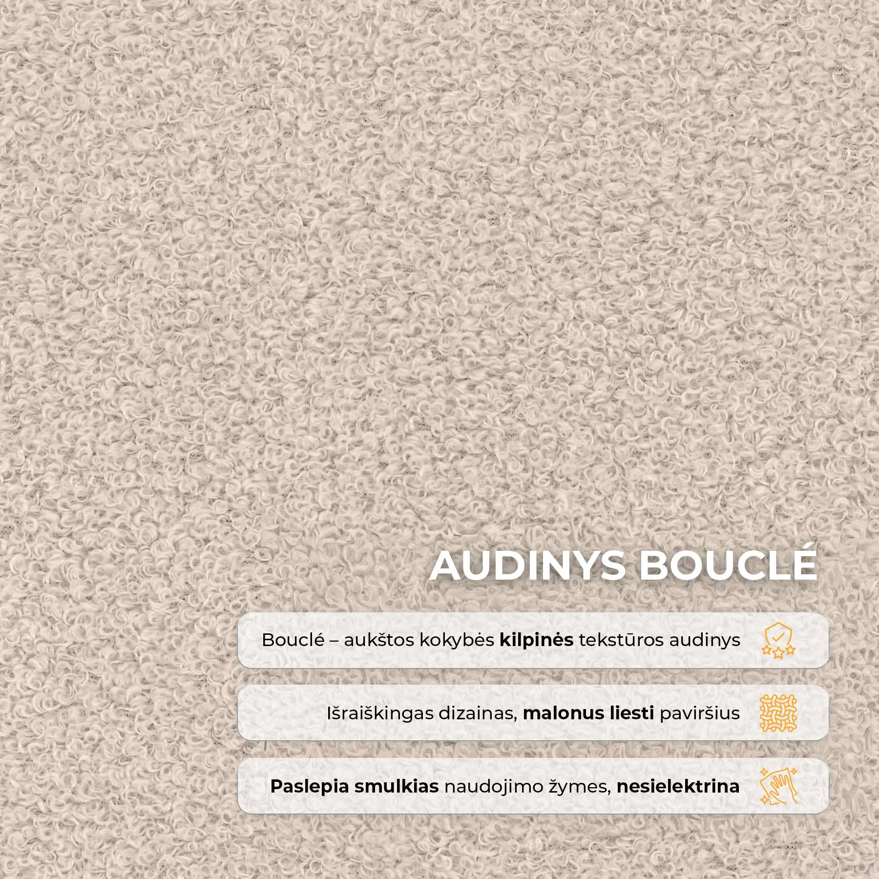 Bouclé audinys šiai lovai suteikia ypatingo žavesio ir jaukumo. Jo minkšta, šiek tiek grublėta tekstūra vilioja prisiliesti bei kuria šiltą ir komfortišką miegamojo atmosferą. Šviesus audinio atspalvis vizualiai praplečia erdvę, suteikdamas kambariui šviesos ir lengvumo. Tai stilingas sprendimas, kuris pabrėžia lovos elegantišką dizainą ir leidžia jai tapti tikra miegamojo interjero puošmena.
